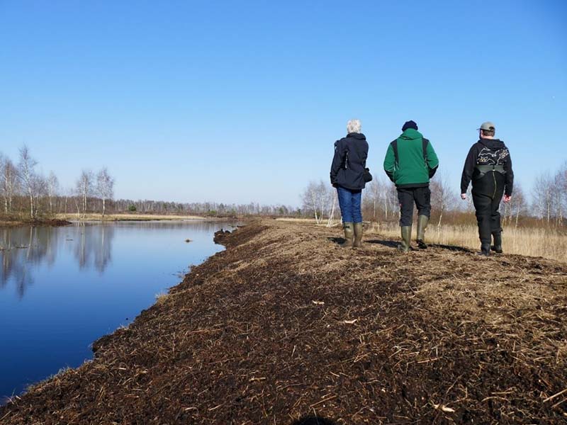 - Insgesamt wurden 2.600m Torfverwallungen durch Spezialraupen mit extra breiten Moorlaufwerken aufgeschoben und neu errichtet. Die höheren Außen- und etwas niedrigeren Zwischenverwallungen haben die Funktion, das Wasser auf kleineren „Polderflächen“ zurückzuhalten, so dass die ausgetrockneten Moorböden trotz unterschiedlicher Geländehöhen möglichst gleichmäßig vernässt werden.