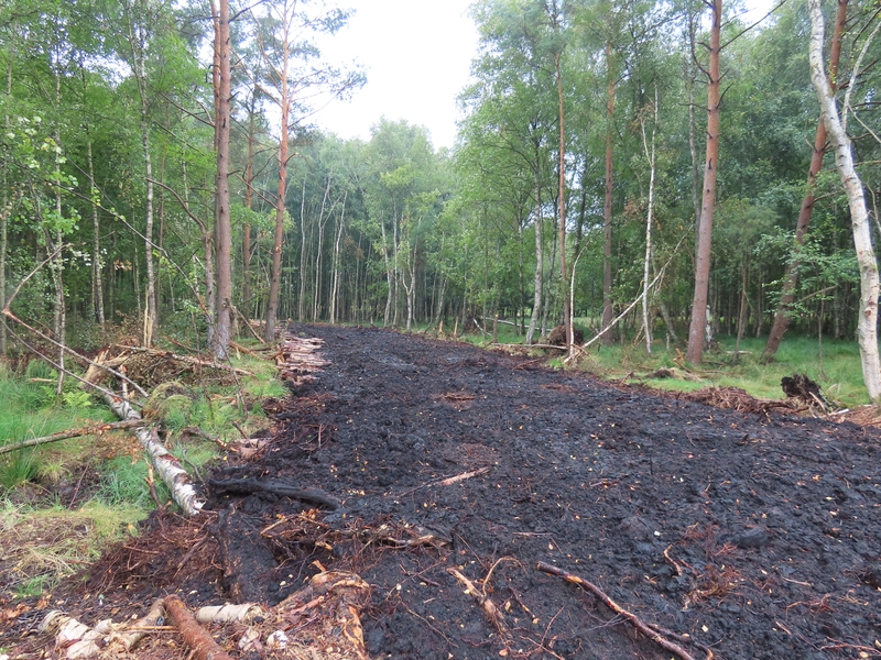 Um diesen Ansprüchen zu genügen, müssen die Baumaschinen im Natur- und Landschaftsbau strenge Auflagen hinsichtlich des maximalen Auflastdrucks pro Quadratzentimeter erfüllen, sodass die Böden nicht übermäßig verdichtet bzw. die Vegetationsdecke geringstmöglich geschädigt wird. Um die ökologisch sensible Moorvegetation minimal zu belasten, wurden auch die Transportwege für den Torf möglichst kurz und schmal konzipiert. Hierfür wurden 4-5m breite, temporäre Transporttrassen eingerichtet, welche aus mehrlagig übereinander geschichteten Fichtenstammabschnitten bestanden. Bereits seit Jahrhunderten ermöglicht diese durch Rundholz oder Bohlen befestigte Wegbauweise dem Menschen sicheren Zugang in das Moor. Die dazu verwendeten Fichtenstämme wurden vorab aus dem Projektgebiet gewonnen und waren überwiegend dem Borkenkäfer zum Opfer gefallen. Sie liegen nach dem Rückbau der Trasse umgelagert für den nächsten Bauabschnitt zur Wiederverwendung bereit.