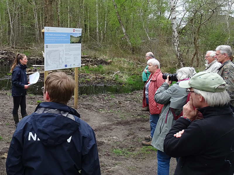 Seit Beginn des LIFE+ Projektes begleitet der Beirat das Projekt. Ende April hatte das Projektmanagement zur Besichtigung der ersten abgeschlossenen Baumaßnahmen ins Schwarze und ins Otternhagener Moor eingeladen. Elf von zwölf Beiratsmitgliedern ließen sich vom Projektteam vor Ort die ersten Umsetzungsergebnisse aus den Bereichen Gehölzentnahme und Dammbau zeigen und erläutern. Trotz anhaltender Dürre in den letzten Wochen war in den Arbeitsbereichen am Rand der Moore viel angestautes Wasser zu sehen, was sowohl vom Beirat als auch vom Projektteam mit Freude zur Kenntnis genommen wurde.