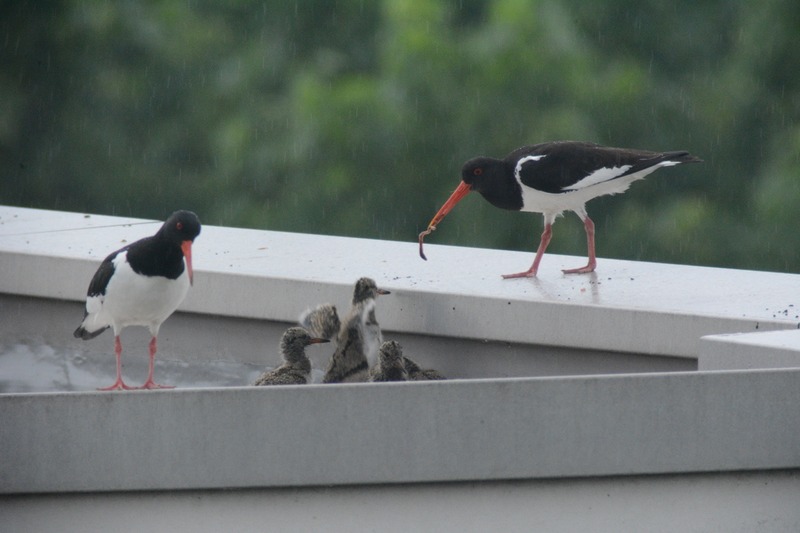 Knapp 6 Wochen nach der Entdeckung brütender Austernfischer auf einem innenstadtnahen Flachdach in Leer konnte heute erstmals „Schlupferfolg“ vermeldet werden: 4 Küken flitzten über die ca. 400 m² große Fläche zum Futter-eintragenden Altvogel am Dachrand. Austernfischergelege umfassen im Schnitt drei Eier. Vier erfolgreich geschlüpfte und anscheinend sehr vitale Küken stellen auch angesichts des ungewöhnlichen Aufzuchtbiotops ein bislang bemerkenswertes Ergebnis dar. Wir bleiben dran!