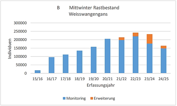 Aus diesen Mittwinterzählungen in den EU-Vogelschutzgebieten kann jedoch nicht der absolute Rastbestand für Niedersachsen abgelesen werden, ebenso ist eine flächendeckende Erfassung außerhalb der Vogelschutzgebiete nicht erreichbar. Die Hauptrastgebiete befinden sich jedoch innerhalb der für die arktischen Gänse ausgewiesenen EU-Vogelschutzgebiete. Somit werden gut 70 % des Gesamtrastbestandes durch das Monitoring erfasst.