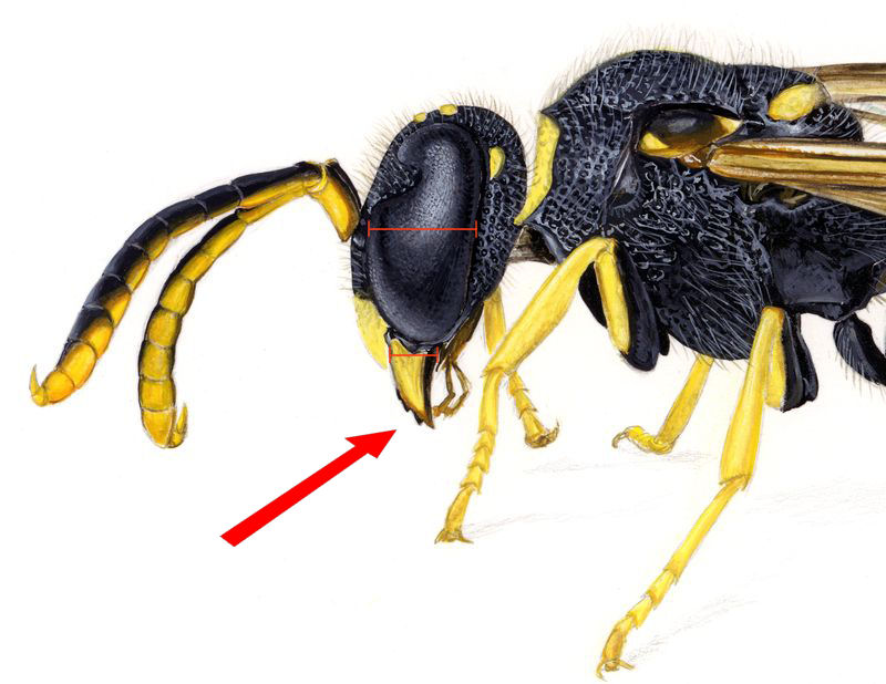 Ja, es ist eine Lehmwespenart, wenn in der Seitenansicht die Kiefernzange schmaler als die Augenbreite ist. (Die einzelnen Lehmwespenarten können von Laien nicht genauer bestimmt werden!) (Gesamtansicht)