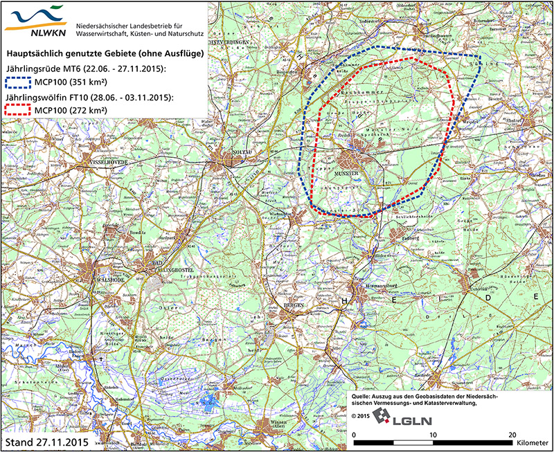Streifgebiete von Jungwölfen können durch das beschriebene Verhalten größer als die Elternreviere sein. Die in Abb. 2 dargestellten sogenannten Minimum-Convex-Polygone (MCP100) stellen die hauptsächlich genutzten Gebiete der beiden Jungwölfe dar. Das heißt: offensichtliche Erkundungsausflüge wurden hier bewusst nicht berücksichtigt. Das Revier des Munsteraner Elternrudels wird in etwa dem Durchschnitt der MCPs der beiden Jährlinge entsprechen.