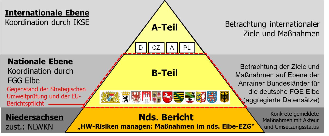 Neben dem nationalen HWRM-Plan für den deutschen Anteil an der Flussgebietseinheit Elbe gibt es auch einen internationalen HWRM-Plan für das gesamte Elbeeinzugsgebiet. Dieser übergeordnete Plan der EU-Mitgliedsstaaten Tschechische Republik, Polen, Österreich und Deutschland wird durch die Internationale Kommission zum Schutz der Elbe (IKSE) koordiniert.