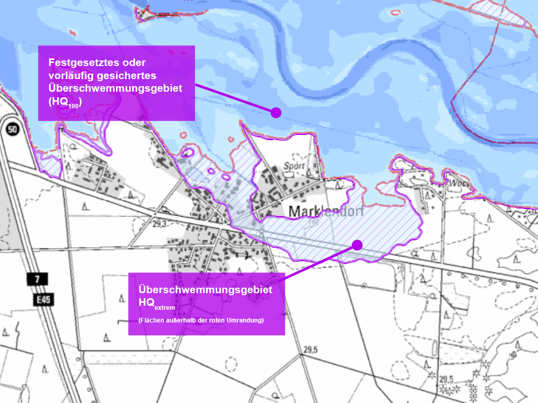 Diese Gebiete bezeichnen demnach die bei einem HQextrem (Blautöne, Wassertiefendarstellung) über das festgesetzte bzw. vorläufig gesicherte Überschwemmungsgebiet (HQ100, rote Umrisse) hinaus überschwemmte Fläche. In der Grafik ist als Beispiel Marklendorf dargestellt, die „Risikogebiete außerhalb von Überschwemmungsgebieten“ sind lila schraffiert und abgegrenzt.
