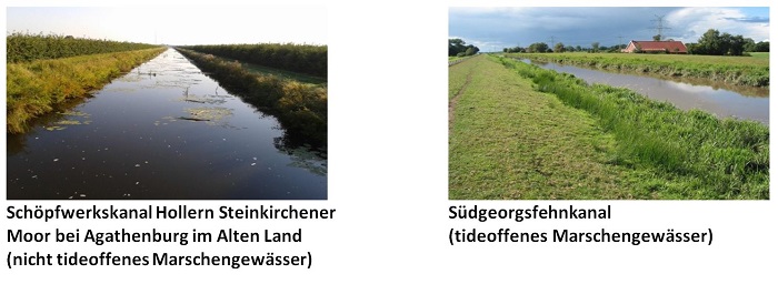 Daher hat sich als Grundlage einer den Aufbau funktionierender Bewertungsverfahren unterstützenden Typologie für Marschengewässer in der Praxis die Trennung in tideoffene und nicht tideoffene Gewässer (zzgl. der Ströme, Subtyp 22.3) als zielführend erwiesen. Diese Trennung zeigt sich sowohl beim Makrozoobenthos als auch bei den Makrophyten als prägend für die Artengemeinschaften.