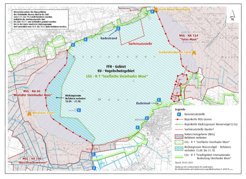 Winterfahrverbot: Die Wasserfläche des Steinhuder Meeres darf in der Zeit vom 1.11. bis 19.3 gemäß § 19 (3) der Dümmer und Steinhuder Meer-Verordnung nicht befahren werden. Lediglich die Surfeinsatzstelle darf bis zum 15.11. noch von Surfenden genutzt werden. Der in der Abbildung 2 markierte Rückzugsraum darf aufgrund von Regelungen in der Verordnung zum LSG „Seefläche Steinhuder Meer“ zusätzlich vom 15.9. bis 19.3. nicht befahren werden.