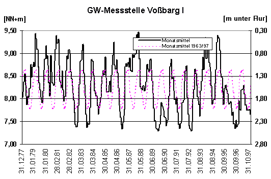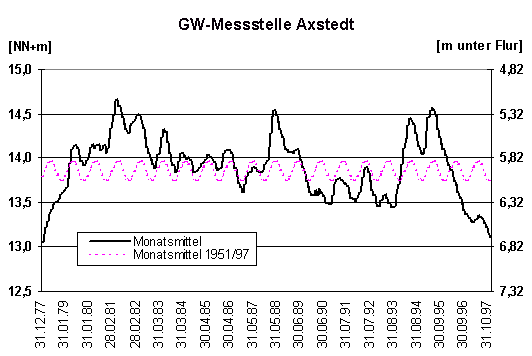 Der zeitliche Verlauf des Grundwasserstandes an einer Messstelle wird üblicherweise durch eine sich über mehrere Jahre erstreckende Ganglinie wiedergegeben (Abb. 1-3). Ganglinien zeigen typische Strukturen, die auf den Witterungsablauf im Jahresgang, aber auch auf geologische, hydrologische und bauliche Faktoren zurückgeführt werden können.