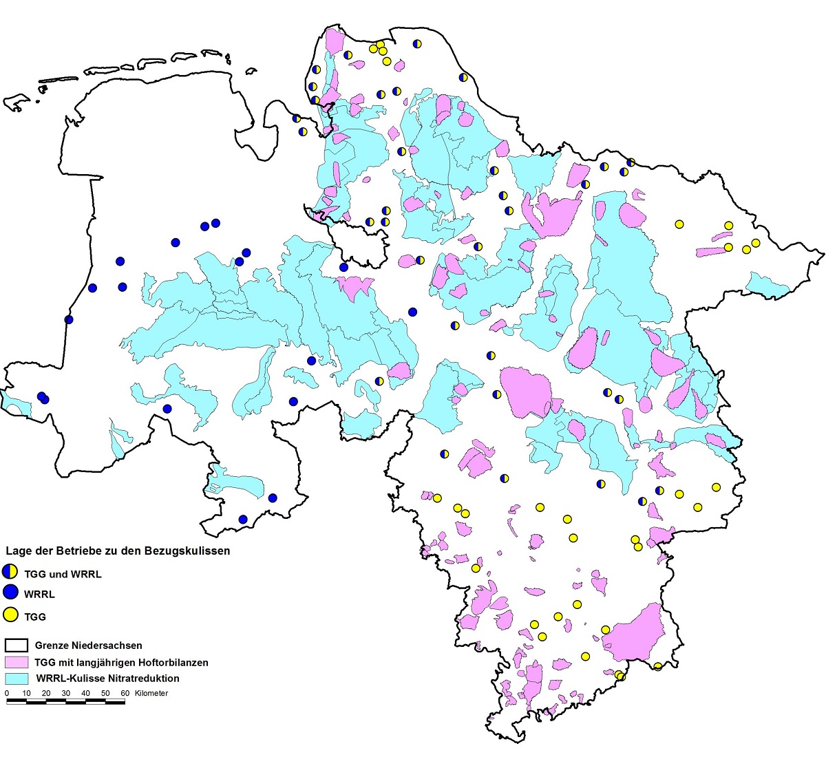 Für die in dem Projekt vorgenommenen Vergleiche der Stickstoff-Hoftorbilanzsalden innerhalb und außerhalb der Beratungsgebiete wurde ein Referenzbetriebsnetz mit insgesamt 82 landwirtschaftlichen Betrieben in Niedersachsen aufgebaut. Da in den Trinkwassergewinnungsgebieten Nordwest-Niedersachsens keine Hoftorbilanzen erhoben werden, wurden in diesem Bereich auch keine Referenzbetriebe zu den Trinkwassergewinnungsgebieten installiert. In den landesweiten Mittelwerten finden solche überwiegend viehstarken Gebiete insofern Berücksichtigung, als die Mittelwertbildung flächengewichtet anhand der flächenhaft vorliegenden Wirtschaftsdüngerklassen erfolgt.