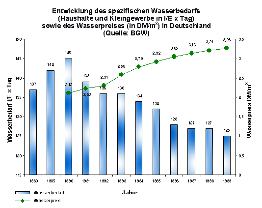 Wasserverbrauch in den Jahren von 1991 bis 1999 in den Haushalten und Kleingewerben um 10%