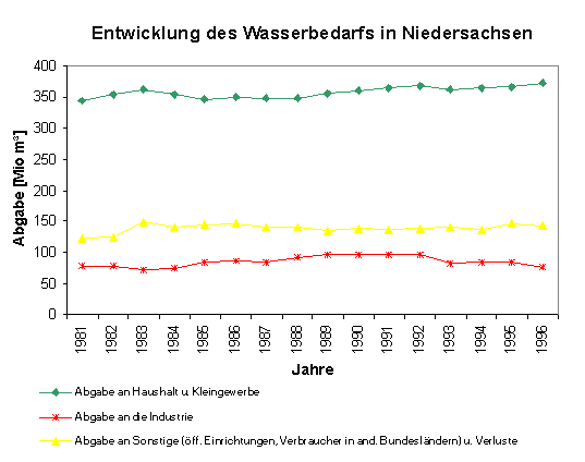Die Bevölkerung und die aus dem öffentlichen Versorgungsnetz mitversorgten Verbraucher beziehen ausschließlich Trinkwasser. Der Trinkwasserverbrauch der Industrie wird in Niedersachsen nur zu einem kleinen Teil von der öffentlichen Wasserversorgung gedeckt. Die landwirtschaftliche Feldberegnung wird mit oberflächennahem Grundwasser oder Wasser aus benachbarten Gewässern durchgeführt.