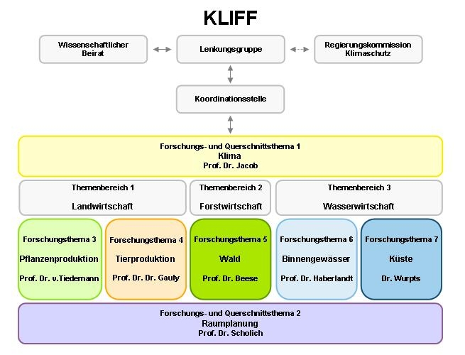 Das KLIFF-Verbundprojekt befasst sich mit den Auswirkungen von Klimaänderungen auf die Pflanzen- und Tierproduktion, auf die Waldwirtschaft sowie auf Binnengewässer und die niedersächsische Küste. Eingefasst sind diese Themenbereiche durch zwei Querschnittsthemen (Klima und Raumplanung), die die drei Themenbereiche Land-, Forst- und Wasserwirtschaft ergänzen (s. Abb.).