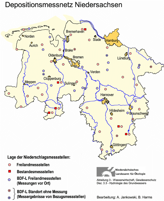 Die Überwachung der Niederschlagsbeschaffenheit auf Säurebildner, Nährstoffe und Schwermetalle erfolgt in Niedersachsen seit 1984 im Rahmen des GÜN-Messprogramms Niederschlagsbeschaffenheit (siehe obenstehende Abbildung). Derzeit umfasst das Messnetz 35 Freilandmessstellen und 6 Bestandesmessstellen. Im Bestandesniederschlag sind auch von den Bäumen ausgefilterte und an den Blattoberflächen abgelagerte Luftinhaltsstoffe enthalten, die mit dem Niederschlag von den Pflanzen abgewaschen werden. Dieses hat zur Folge, dass unter Baumbeständen im Traufbereich infolge der Auskämmwirkung der Vegetationsoberfläche ein erhöhter Stoffeintrag stattfindet.