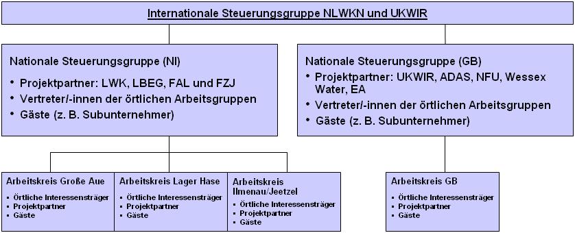 Zur Kommunikation zwischen den verschiedenen Akteuren in diesem Projekt ist eine Projektstruktur aufgebaut worden, die den Dialog sowohl auf den verschiedenen Arbeitsebenen (Pilotgebiete, nationale Umsetzung, internationaler Erfahrungsaustausch) als auch zwischen diesen Ebenen fördern und unterstützen soll.