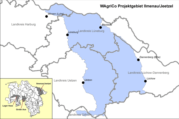 Das Pilotgebiet, das den niedersächsischen Teil der genannten Grundwasserkörper umfasst, hat eine Größe von insgesamt 2052 km². In wesentlichen Anteilen liegt es in den Landkreisen Lüneburg, Lüchow-Dannenberg und Uelzen. Kleine Anteile befinden sich in den Landkreisen Harburg und Gifhorn. Bei den Grundwasserkörpern im Pilotgebiet handelt es sich um den Grundwasserkörper Ilmenau Lockergestein rechts, 1424 km²) und um den Grundwasserkörper Jeetzel Lockergestein links, 611 km²). Der Grundwasserkörper Ilmenau rechts setzt sich aus den Teilräumen Lüneburger Geest Ost (1079,5 km²), der Elbeniederung (288,5 km²) und Elbmarsch (55,7 km²) zusammen. Der Grundwasserkörper Jeetzel links besteht aus den Teilräumen Lüneburger Geest Ost (456,6 km²), der Elbeniederung (57,4 km²) und der Altmark mit der Coblitz-Letzlinger Heide (96,9 km²).