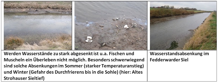 - Maßnahmen zur Verminderung von starken Wasserstandsschwankungen - Erarbeiten eines wasserwirtschaftlichen Konzepts zum Wasserstandsmanagement; z.B. Anlage von Retentionsflächen zur Vergleichmäßigung des Wasserstands. Ziel der Maßnahmen sollte die Verringerung der Ufererosion und die Begünstigung von Ufer- und Gewässervegetation sein. Geeignete Maßnahmen stellen eine optimierte Steuerung bei Sielzug / Zuwässerung, eine Anhebung der Winterwasserstände und die Sicherung von Mindestwasserständen durch Einbau von Grundschwellen dar. Zur Kompensation des verminderten Speicherraums kann die Anlage von Speicherpoldern oder von Nebengewässern eine sinnvolle Begleitmaßnahme sein. Bei tidebeeinflussten Gewässern kann der Einbau von Grundschwellen zur Dämpfung der Auswirkungen eines anthropogen stark erhöhten Tidehubs dienen.