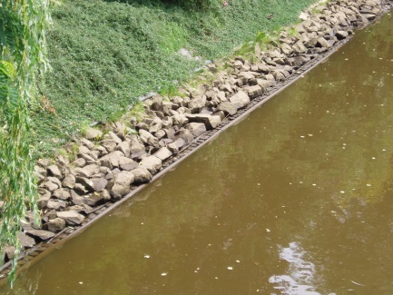 Technische Ufersicherung ohne positive Effekte auf die Uferlebensräume. Hier sind Alternativen zu prüfen, die zusätzlich zu einer Erhöhung der Strukturvielfalt beitragen und die Vernetzung von Wasser- und Uferlebensraum verbessern.