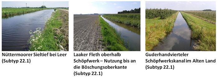 Subtyp 22.1 „Gewässer der Marschen“: In Niedersachsen und Bremen werden all jene Gewässer der Marschen dem Subtyp 22.1. zugeordnet, deren Wasserhaushalt künstlich über ein Siel- und/oder ein Schöpfwerk gesteuert wird. Sie sind nicht mehr unmittelbar tidebeeinflusst und entwässern in die Ästuare oder deren größere Nebengewässer bzw. in das Wattenmeer. Durch die anthropogen regulierten und somit nur zeitweise auftretenden Abflüsse haben diese Gewässer einen überwiegend stehenden oder nur zeitweise fließenden Charakter. Die auftretenden Fließgeschwindigkeiten sind somit meist gering und der größte Teil der Gewässer des Subtyps 22.1 ist süßwassergeprägt. Brackwassereinfluss zeigt sich insbesondere im Bereich der Abschlussbauwerke – teilweise im Nahbereich der Küste ggf. auch großräumiger, z.B. durch Aufstieg versalzenden Grundwassers oder durch zeitweise Zuwässerung aus dem Brackwasserbereich von Tideströmen.