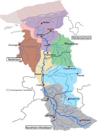 Das gesamte Flussgebiet der Ems umfasst eine Fläche von ca. 18.000 Quadratkilometern, grenzt im Osten an das Flussgebietssystem der Weser und im Süden und Westen an das Rheineinzugsgebiet.