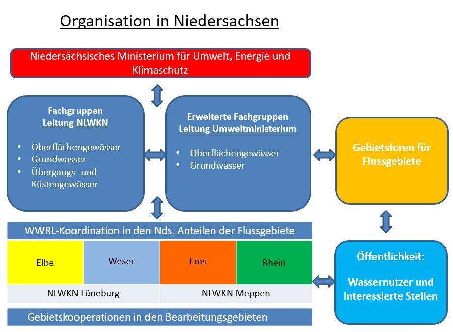 Zuständig für die Umsetzung der WRRL in Niedersachsen ist das Niedersächsische Ministerium für Umwelt, Energie und Klimaschutz. Wesentliche Schritte zur Umsetzung der WRRL sind dem NLWKN übertragen worden. Die im NLWKN gegründeten Fachgruppen für Oberflächenwasser, Grundwasser, Übergangs- und Küstengewässer, bestehend aus Vertretern des Niedersächsischen Ministeriums für Umwelt, Energie und Klimaschutz, des NLWKN, des Landes Bremen sowie anderer Behörden des Landes Niedersachsen befassen sich mit Fragen der strategischen und fachlichen Umsetzung der Richtlinie. Ergänzend gibt es, unter Leitung des Niedersächsischen Ministeriums für Umwelt, Energie und Klimaschutz, die erweiterten Fachgruppen Oberflächengewässer und Grundwasser, die sich aus Vertretern der kommunalen Spitzenverbände, unteren Wasserbehörden, der Wasserverbände als Körperschaften öffentlichen Rechts, der Kommunalverwaltungen und der land- und forstwirtschaftlichen Fachverwaltung zusammensetzen.