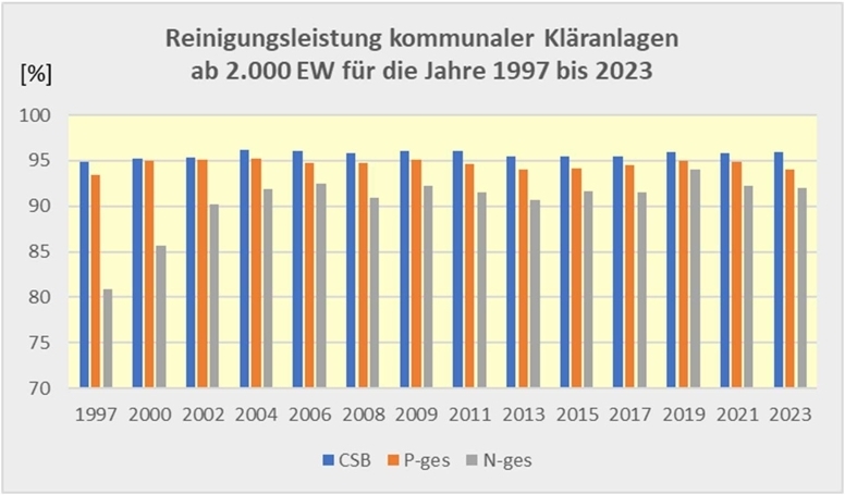 In Niedersachsen gibt es derzeit 566 kommunale Abwasserbehandlungsanlagen. In diesem Bericht werden nur die 437 kommunalen Kläranlagen betrachtet, die eine Reinigungskapazität von mehr als 2.000 EW aufweisen und eine Reinigungsleistung von insgesamt rund 15 Millionen Einwohnerwerten haben. Neben der Schmutzfracht aus den häuslichen Abwässern von rund 7,4 Millionen Einwohnern wird die Schmutzfracht von rund 4,2 Mio. Einwohnergleichwerten aus gewerblichen und industriellen Abwässern in diesen Anlagen mitbehandelt. Der durchschnittliche Frachtabbau dieser Anlagen beträgt 95,9 % beim CSB, 94,0 % beim Phosphor (gesamt) und 91,9 % beim Stickstoff (gesamt).