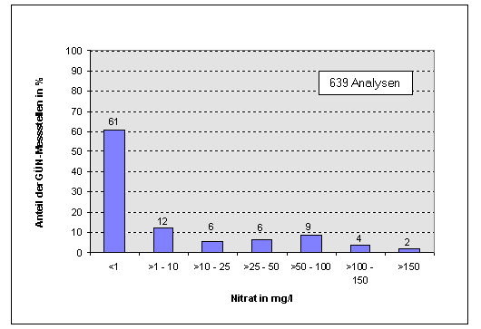 Bei Entnahmetiefen über 25 Meter wurden nur noch in 3,3% der Proben Grenzwertüberschreitungen festgestellt. Nitratkonzentrationen über 100 mg/l kommen ab dieser Tiefe nicht mehr vor.