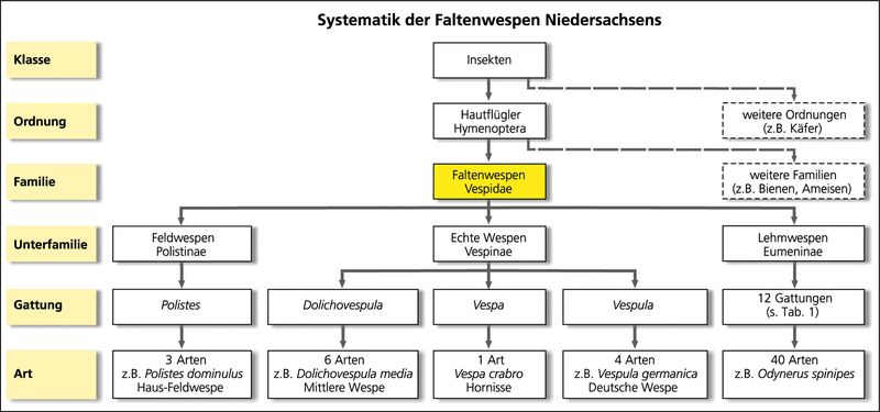 In Niedersachsen gibt es drei Unterfamilien der Faltenwespen: Feldwespen, Echte Wespen und Lehmwespen. Diese drei Unterfamilien werden von den Zoologen wiederum in 16 verschiedene Gattungen aufgeteilt. Insgesamt leben im Niedersachsen 54 verschiedene Faltenwespenarten.
