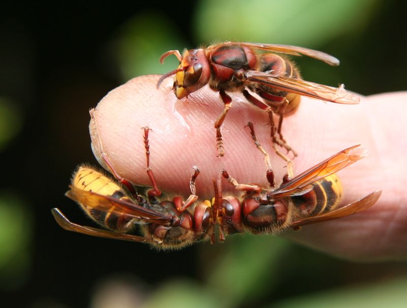 Wenn man ruhig bleibt, begutachten Hornissen im Einzelfall sogar neugierig, aber in der Regel friedlich einen Finger. (Foto: D. Kerstholt)